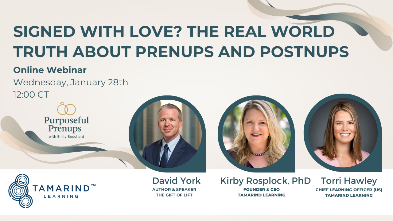Read More >> | | | | Upcoming Webinar: Signed With Love? | | | | Join Dr. Kirby Rosplock, Torri Hawley, and David York for a timely Tamarind Learning webinar exploring how prenups and postnups can be powerful tools for values alignment, communication, and long-term family stewardship.